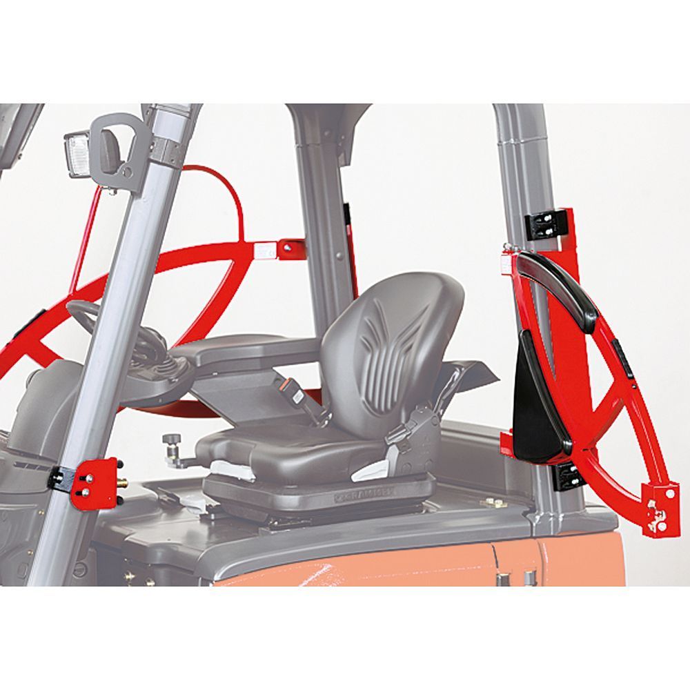 Das Rückhaltesystem für Gabelstapler! Eine Gasdruckfeder hält die Bügeltür für bequemes und schnelles Ein- und Aussteigen geöffnet. Ein kurzer Griff vom Lenkradknauf zur Fernauslösung öffnet das System. Die Außenkontur des Fahrzeugs wird nicht überschritten und die Bewegungsfreiheit des Fahrers nicht eingeschränkt. Ein Doppeldrehfallenschloss bietet höchste Sicherheit und lange Lebensdauer. Optional kann das System mit elektrischen Schließkontakten einfach überwacht werden. Die robuste Stahlkonstruktion bietet für alle Zeit sicheren Schutz. Ein Schulter- und ein Hüftpolster dienen als komfortable Lehne bei Rückwärtsfahrt. Die IWS Sicherheitstüren sind ausserdem für die meisten Staplertypen lieferbar: Caterpillar, Clark, Daewoo, Hyster, Jungheinrich, Komatsu, Linde, Mitsubishi, Nissan, O&K, Still, TCM, Toyota, Yale
